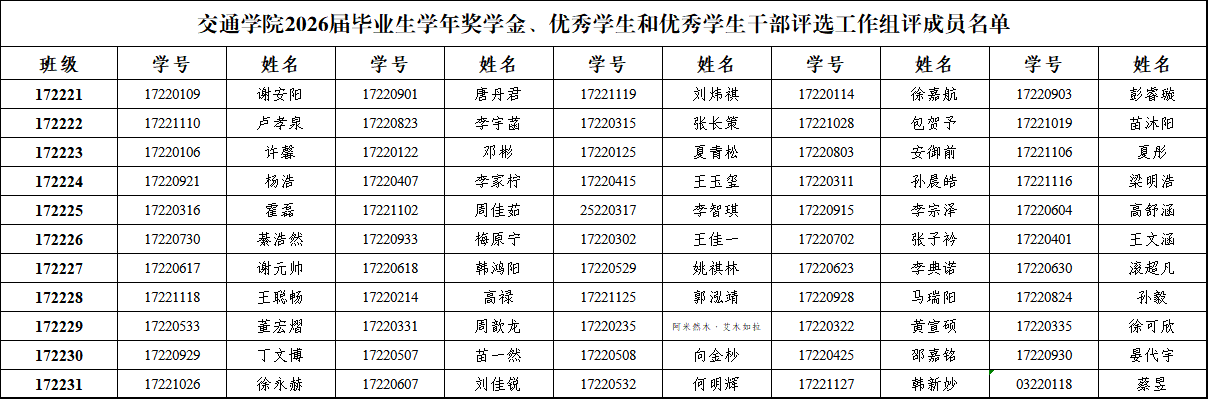 根据党委学生工作部《关于开展2026届毕业生学年奖学金、优秀学生和优秀学生干部评选工作的通知》相关要求,澳门博彩 按照班级为单位成立组评小组(小组成员一般由学生党员、学生干部、学生代表组成,总人数不少于5人,其中设组长1人)。现将2026届毕业生学年奖学金、优秀学生和优秀学生干部评选工作组评小组成员名单公布如下(各组评小组首位为组长)。